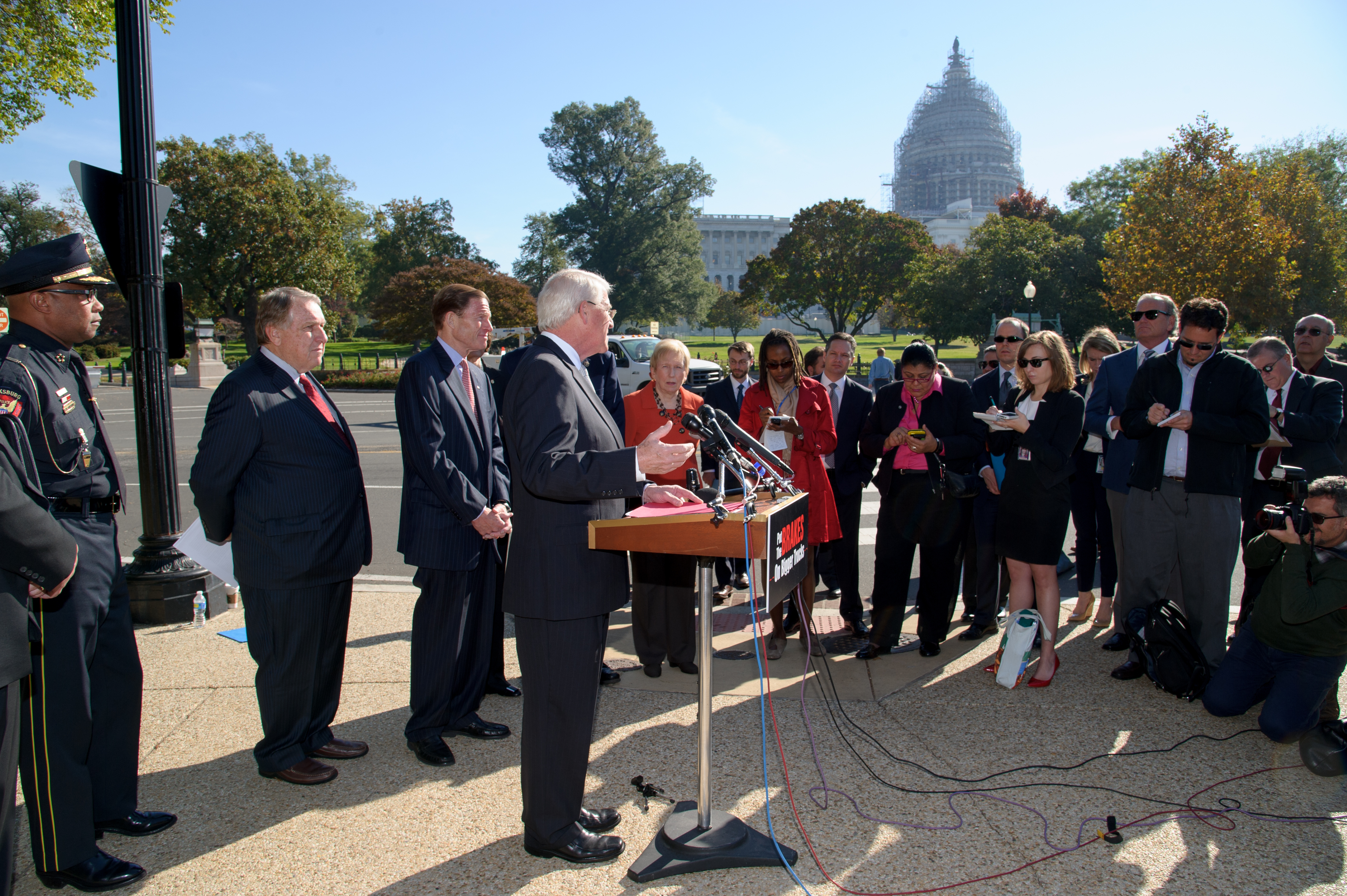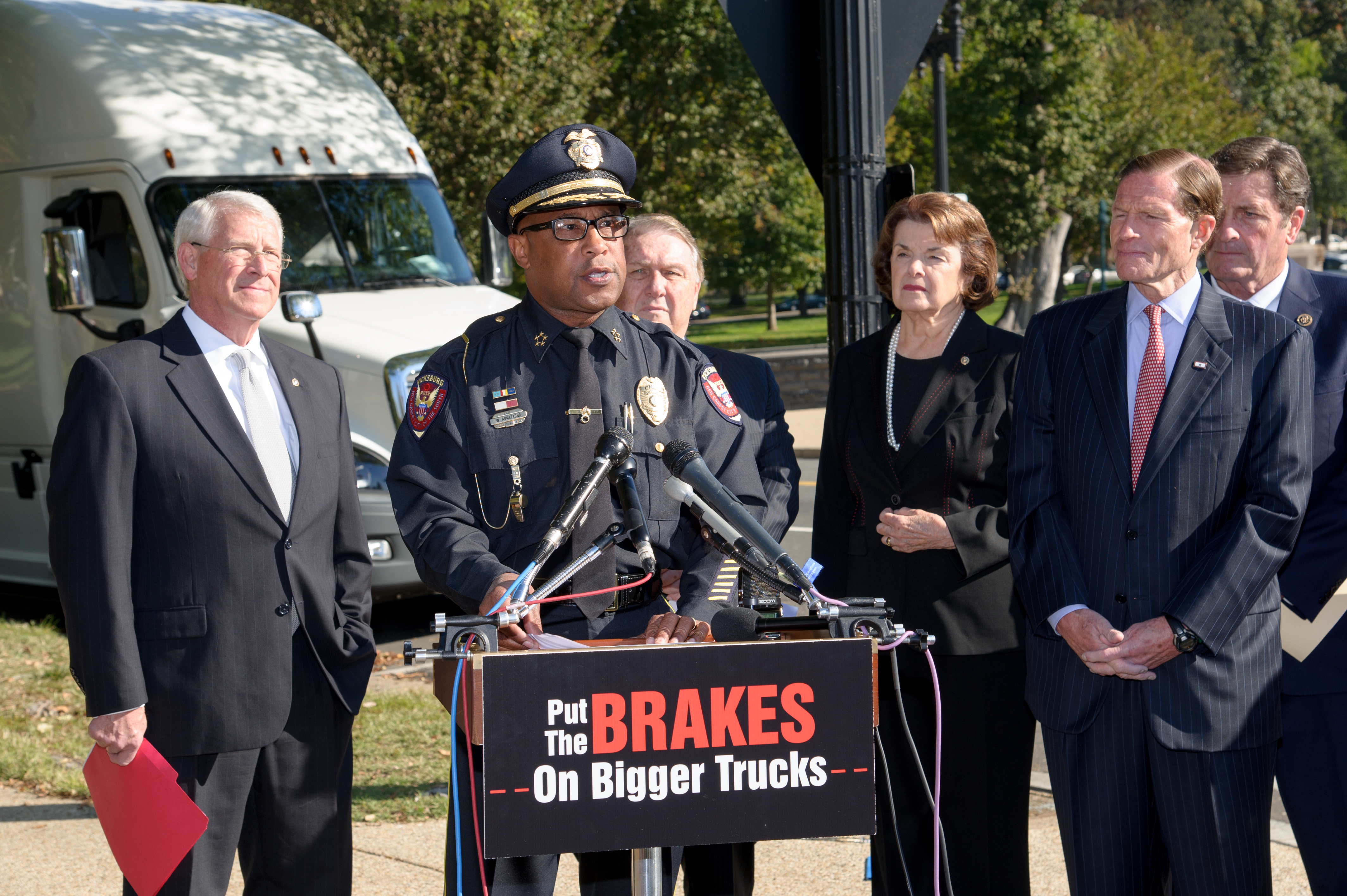 WASHINGTON – At a news conference outside the U.S. Capitol today, U.S. Senators Roger Wicker, R-Miss., Dianne Feinstein, D-Calif., and Richard Blumenthal, D-Conn., outlined their bipartisan opposition to a federal mandate that would allow large trucks to pull double 33-foot trailers on the nation’s highways. The senators were joined by representatives from the trucking industry, Teamsters, law enforcement, and a safety advocacy group. Among those who spoke today was Vicksburg Police Chief Walter Armstrong.